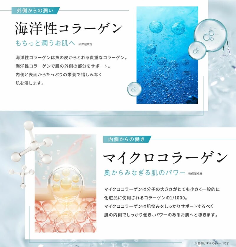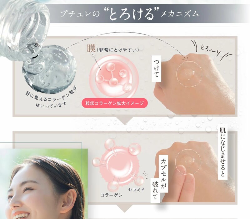 お肌へごちそう!つぶつぶの「みえる」コラーゲンが時間差浸透アプローチ(角質層まで)。