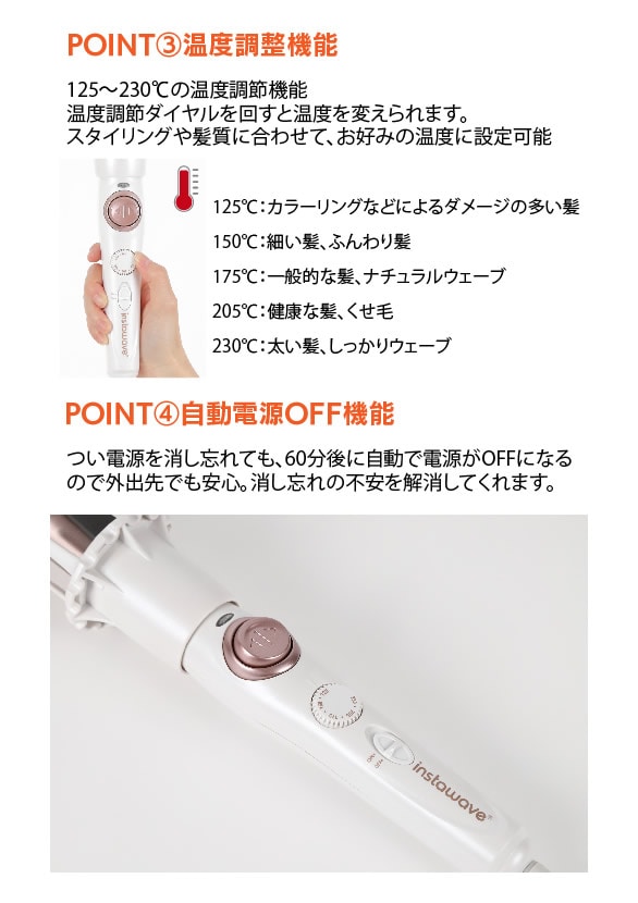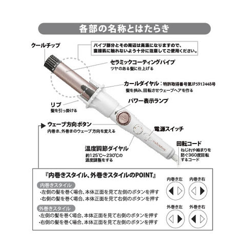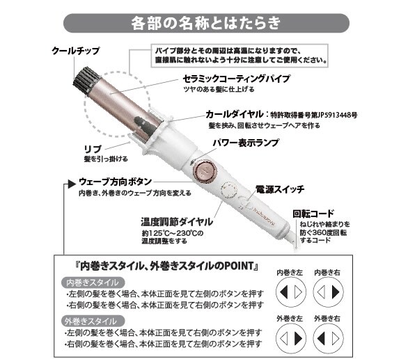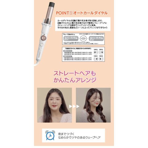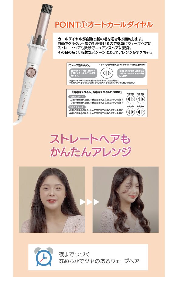 左右に回転するカールダイヤルが自動で髪の毛を巻き取り、内巻き、外巻きがあっという間につくれます!