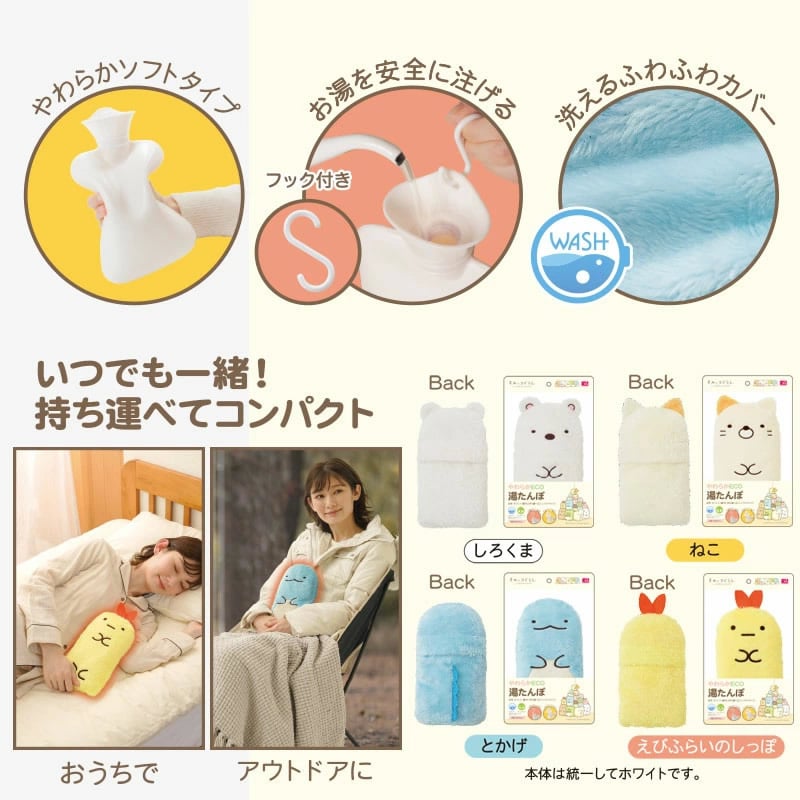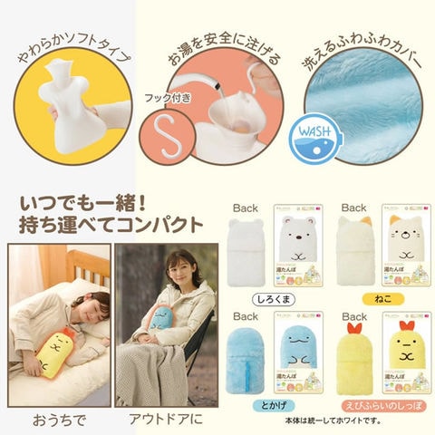 すみっコぐらしの人気のキャラクターが、やわらかくてぷよっとした感触と、ふんわりとした肌ざわりが気持ちいいあったか湯たんぽに!