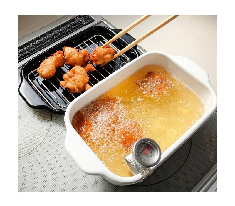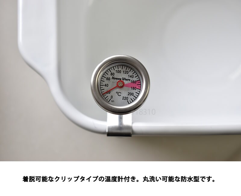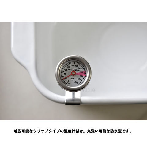 防水型温度計は丸洗いが可能、内面が白色なので油の状態が一目でわかり、全面滑らかなガラス質なので油汚れをすっきり洗い落とせます。