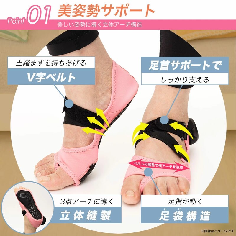 履いた瞬間に足裏アーチを形成する足袋構造+立体縫製サポーター。