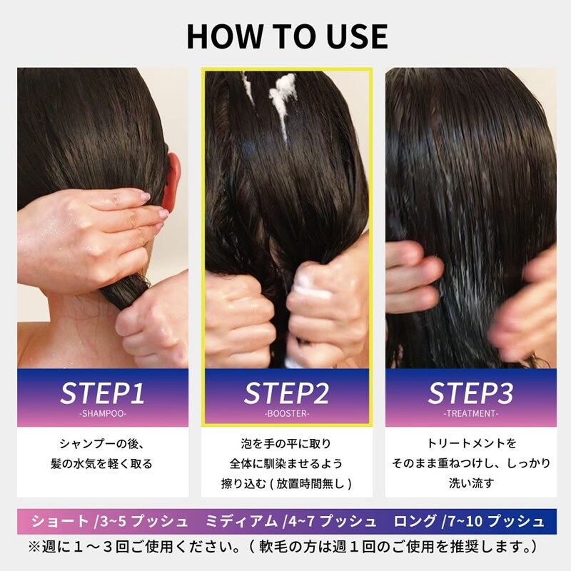 シャンプー後に、エヌナンバートリートメントブースターを髪に馴染ませ、洗い流さずにトリートメントをするだけ。