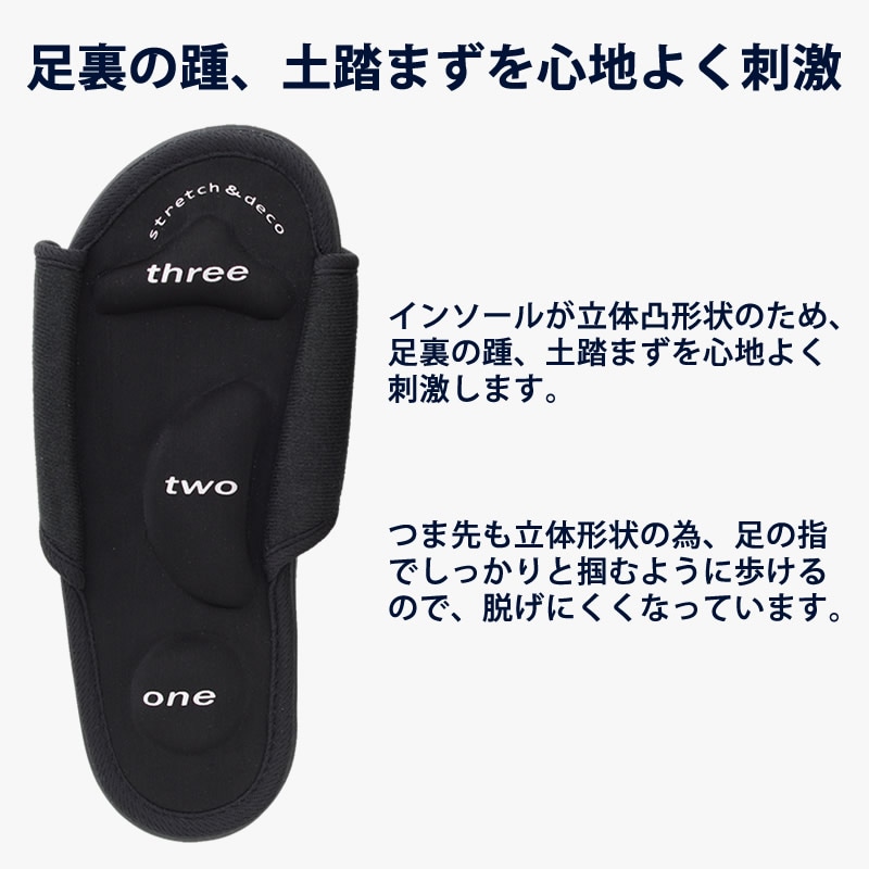 インソールが立体凸形状の為、足裏の踵、土踏まずを心地よく刺激します。