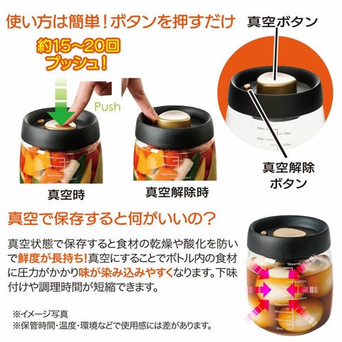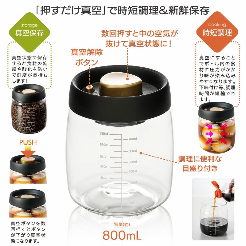 プッシュで時短 真空ポット 真空保存 時短調理 クッキング 新鮮 煮卵 梅干し 漬物 ピクルス 作り置き 調味料 保存 コーヒー豆