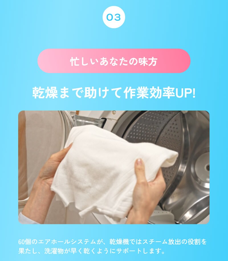 洗濯ボールのエアホールシステムが、乾燥機ではスチーム放出の役割を果たします。