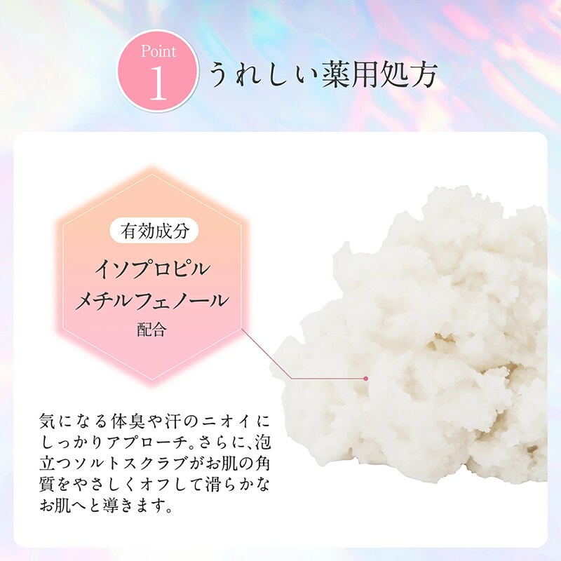 小さな粒のソルトスクラブとクリーミーな泡立ちの洗浄成分がバランス良く配合されたぺースト状のマッサージスムーザー。