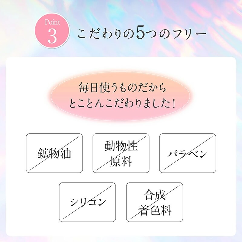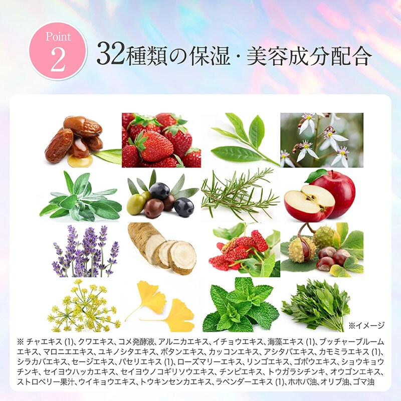 ※・・・コメ発酵液、アシタバエキス、リンゴエキス、ショウガ根茎エキス、ウイキョウエキス、ホホバ油、オリーブ油、ゴマ油、濃グリセリン