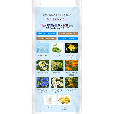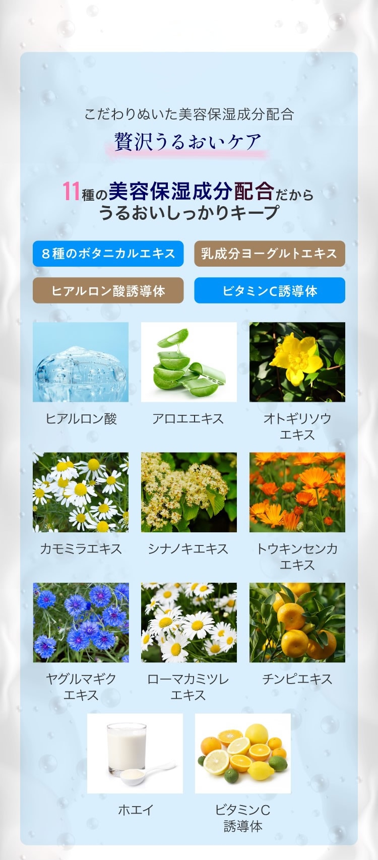 こだわり抜いた美容保湿成分を贅沢に11種類も配合し、汚れをさっぱり洗い流し、必要なうるおいはキープ。