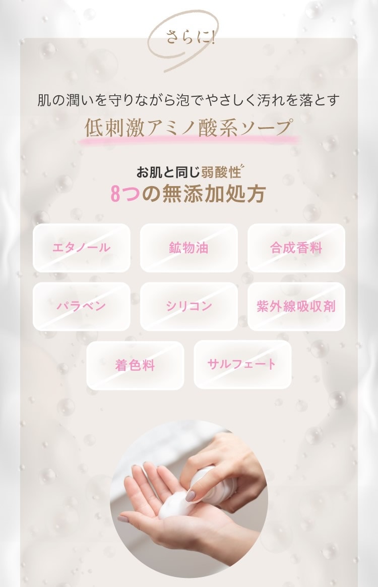 さらに泡タイプだからクリーミーな泡で摩擦による皮膚の刺激も減らし、こすらずに汚れを落とします。