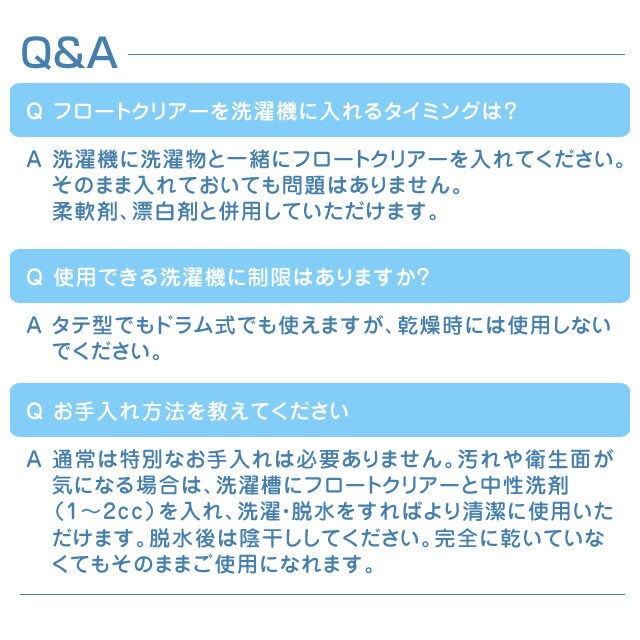 ●通常の使用であれば洗浄の必要はありませんが、汚れや衛生面が気になる場合は、洗濯槽にフロートクリアーと中性洗剤(1~2cc)を入れ、洗濯・脱水をすればより清潔に使用いただけます。