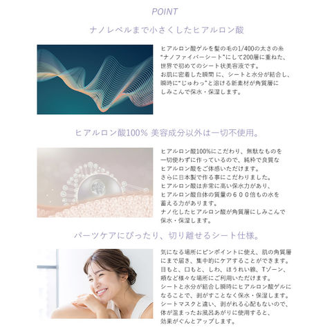 ヒアルロン酸ゲルを髪の毛の1/400の太さの細い糸を“ナノファイバーシート”にして200層に重ねた、初めての化粧品です。