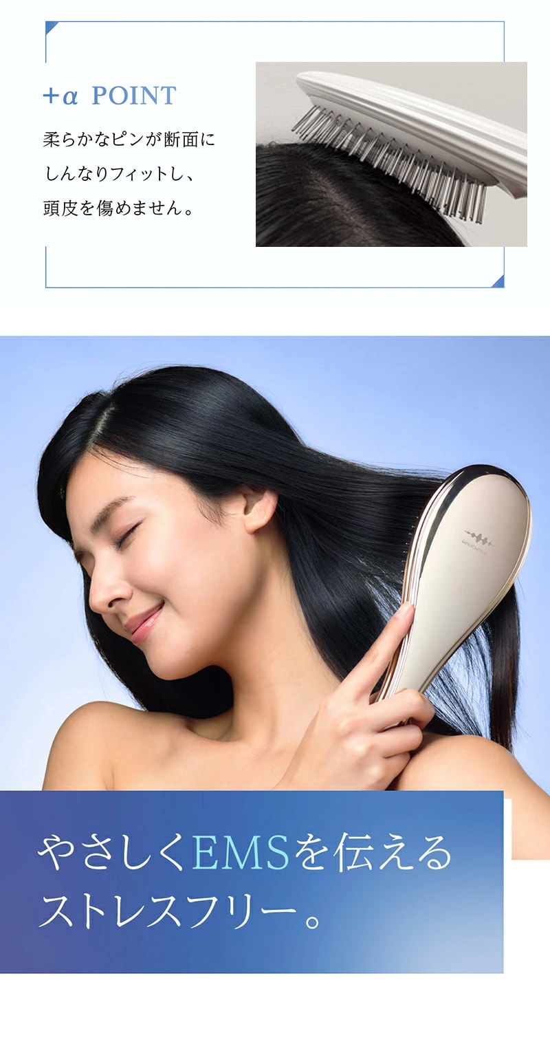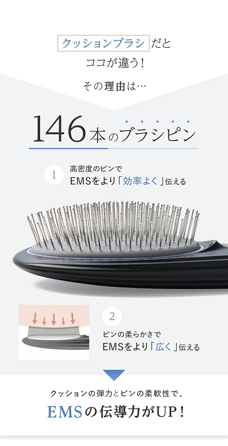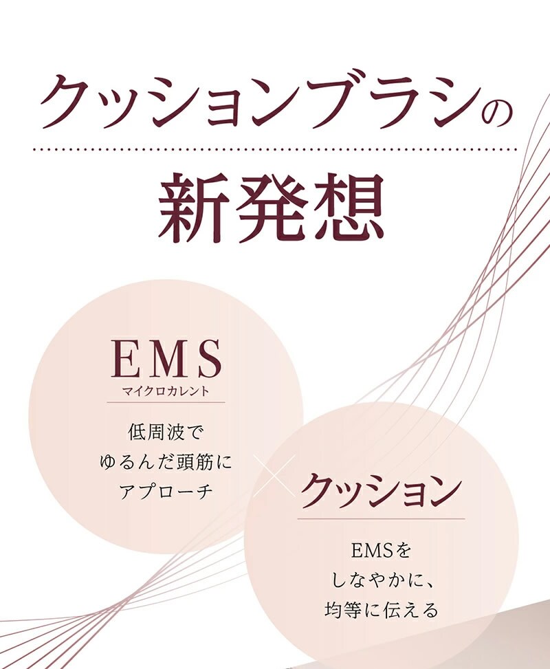 従来のブラシや電気ブラシと異なり、クッションの柔軟性があるため、頭皮を傷めず、やさしくEMSを伝えます。