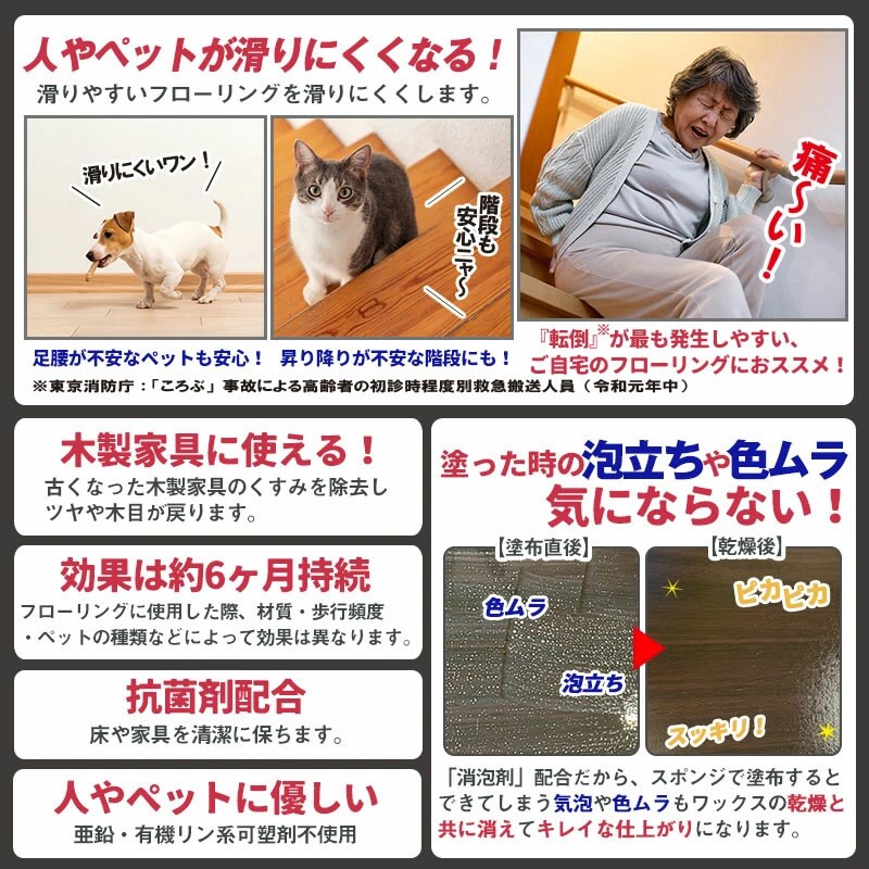 ・ワックスとしては、滑り止めの効果が非常に高く、自宅でペットを飼われている方には非常に安心な仕様となっております。