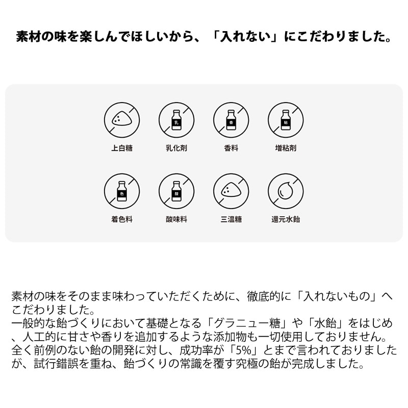 「だいじょうぶなもの」のブランドコンセプトでもある「大切な人に心から”だいじょうぶ”だと思えるものだけを」を体現するために「添加物」を初め、飴づくりには欠かせない「還元水飴」や「グラニュー糖」が一切「入っていない」飴の実現を目指しました。