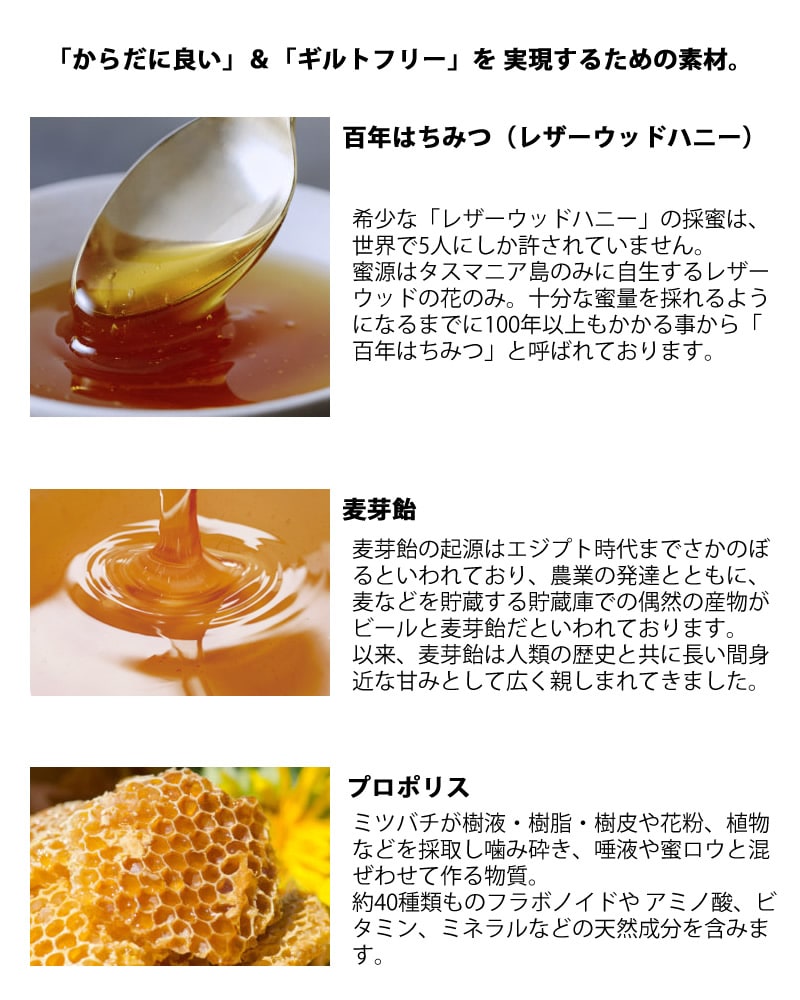 麦芽飴(国内製造)、てんさい含蜜糖、はちみつ、レモン果汁、生姜粉末、ハーブ粉末 エキナセア、カミツレ、カキドオシ 、プロポリスエキス