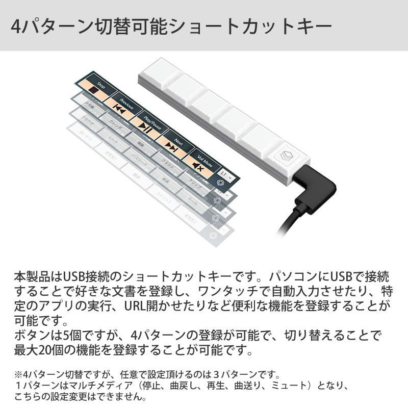 ボタンは5個ですが、4パターンの登録が可能で、切り替えることで最大20個の機能を登録することが可能です。