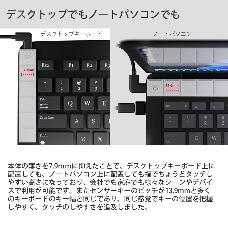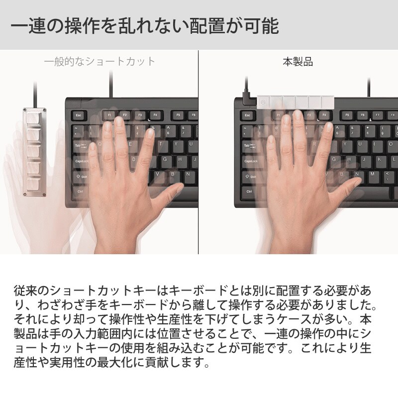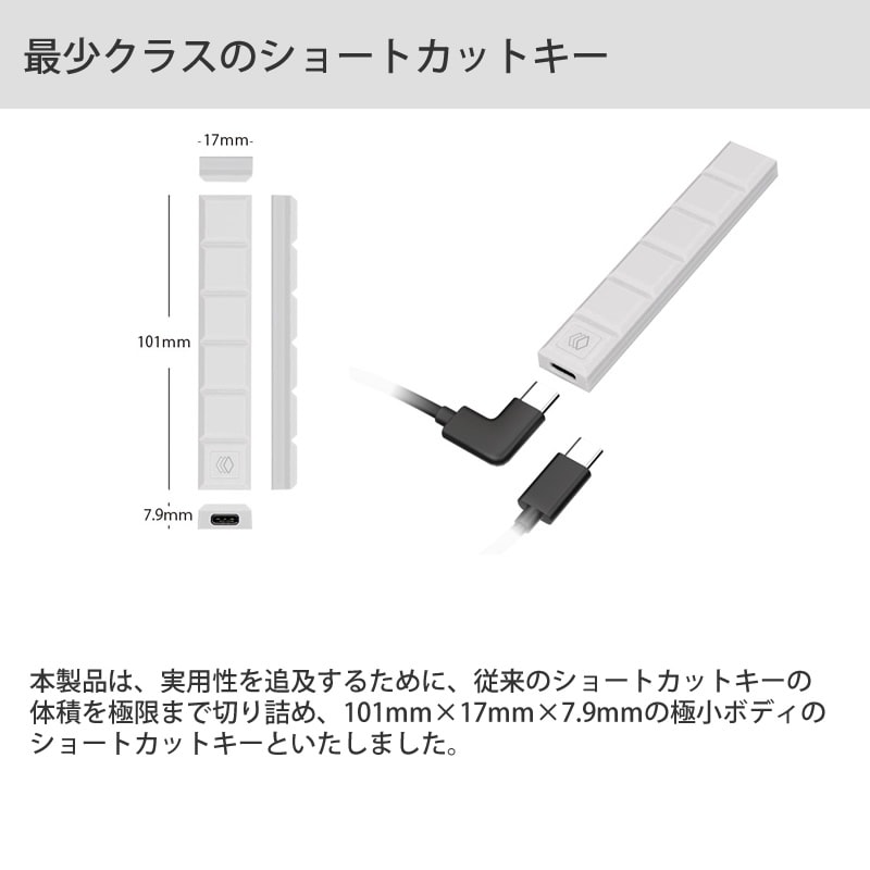 実用性を追及するために、従来のショートカットキーの体積を極限まで切り詰め、101mm×17mm×7.9mmの極小ボディのショートカットキーです。