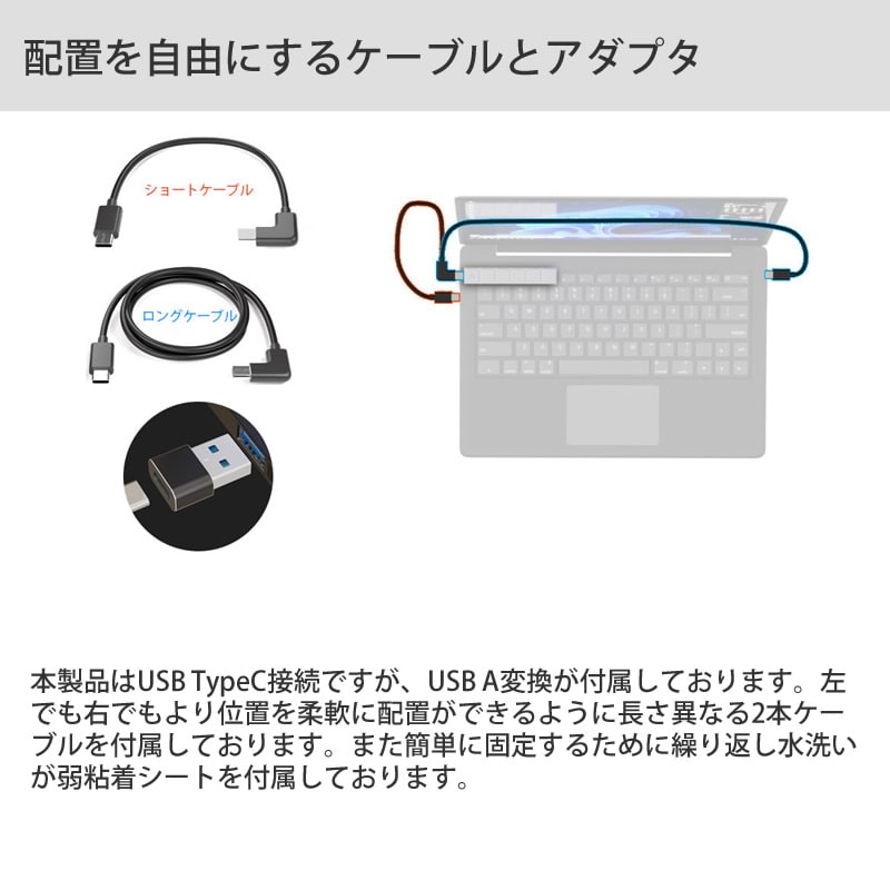 TypeCケーブル(30cm)、TypeCケーブル(120cm)、USB変換アダプタ、本体固定粘着シート
