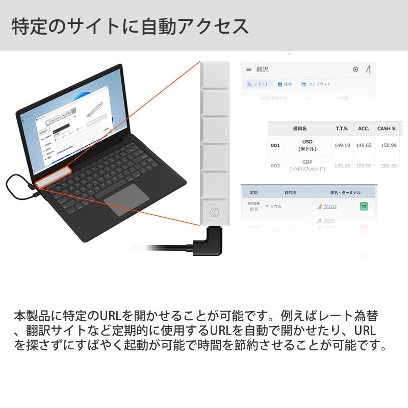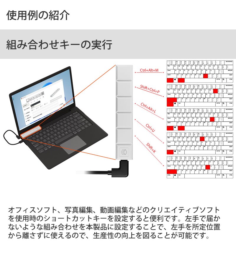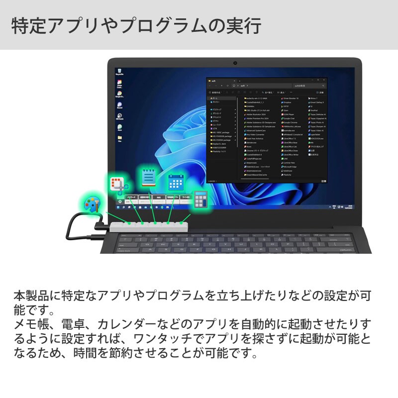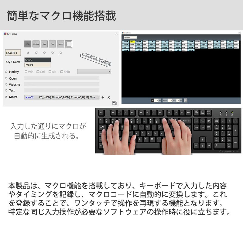 パソコンにUSBで接続することで好きな文書を登録し、ワンタッチで自動入力させたり、特定のアプリの実行、URL開かせたりなど便利な機能を登録することが可能です。