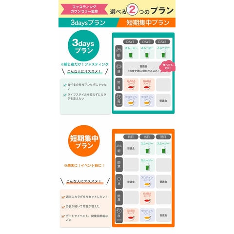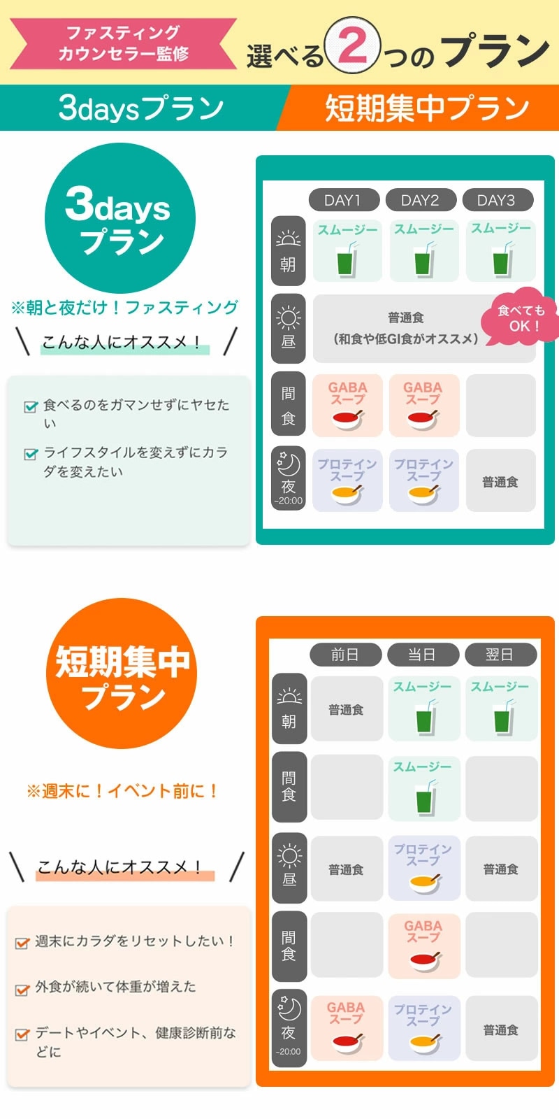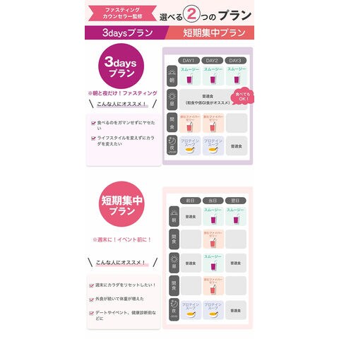 また、2種類のプランから選べ、自分のペースで無理なく始めることができる新しいファスティングです。