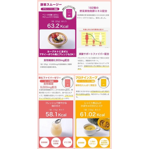 水溶性食物繊維(アメリカ製造)、果糖、砂糖、ぶどう糖、アサイーエキスパウダー、バナナパウダー、脱脂粉乳、野菜ミックスパウダー、グルコマンナン、りんご果汁パウダー、ぶどう果汁パウダー、レモン果汁パウダー、穀物発酵エキス末、植物発酵エキス末、植物発酵物乾燥粉末、パン酵母粉末(ぶどう糖、マンガン含有酵母、亜鉛含有酵母、銅含有酵母、モリブデン含有酵母、ヨウ素含有酵母、セレン含有酵母、クロム含有酵母)、野草発酵エキス粉末/酸味料、増粘多糖類、カラメル色素、甘味料(ステビア)、野菜色素、V.C、香料、抽出V.E、ナイアシン、パントテン酸Ca、V.B1、V.B6、V.B2、V.A、葉酸、V.D、V.B12、(一部に大豆・乳成分・バナナ・やまいも・りんご・オレンジ・カシューナッツ・キウイフルーツ・ゴマ・小麦を含む)