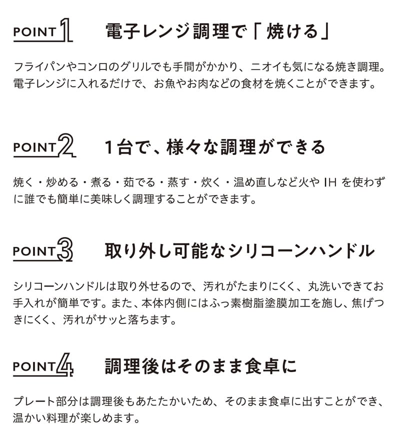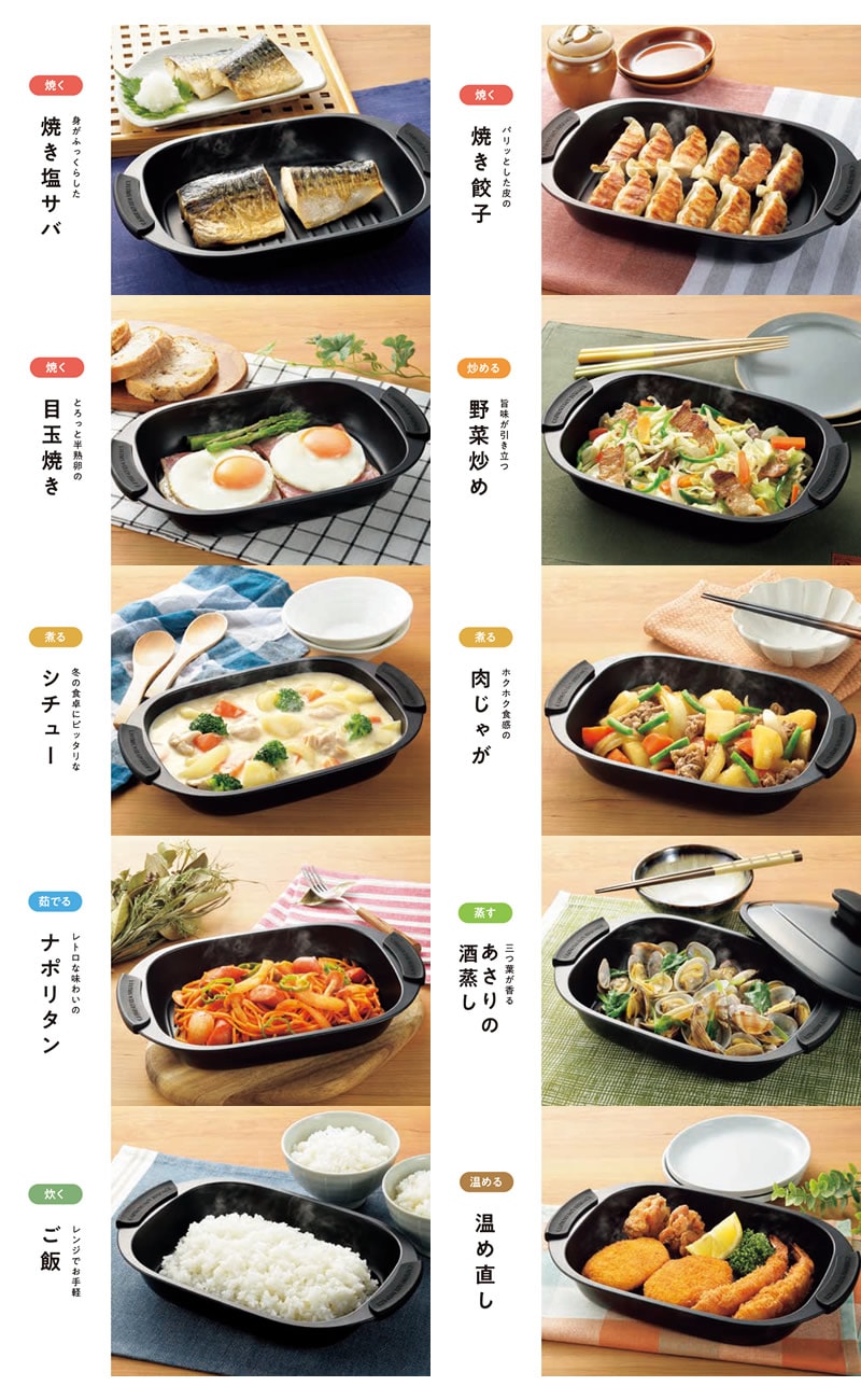 電子レンジで簡単!1台で焼く、炒める、蒸す、茹でる、炊く、煮るが可能な電子レンジ調理器具です。