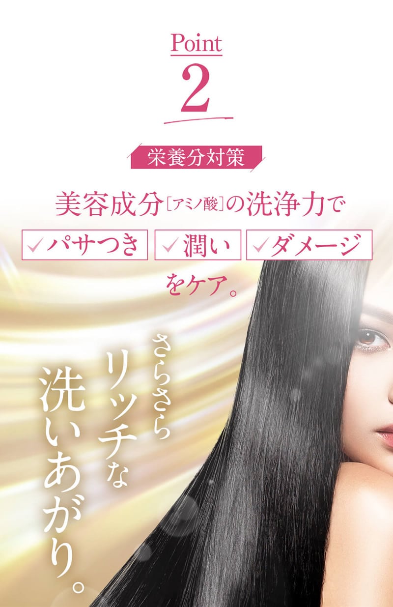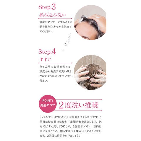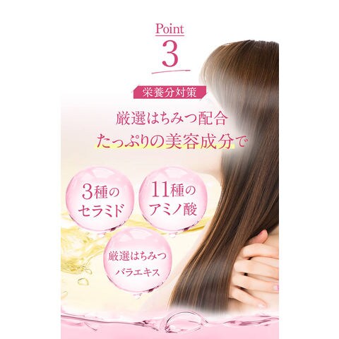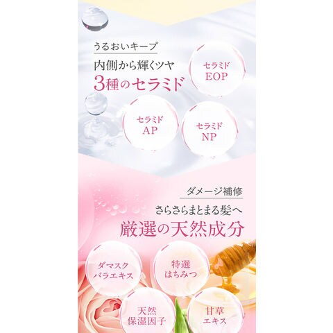 水、ラウレス硫酸Na、DPG、イソステアラミドプロピルベタイン、オレフィン(C14-16)スルホン酸Na、ラウレス-6カルボン酸Na、コカミドプロピルベタイン、ダマスクバラ花油、ダマスクバラ胎座培養エキス、ニオイテンジクアオイ油、レモン果皮油、グリチルリチン酸2K、アルギニン、アスパラギン酸、PCA、グリシン、アラニン、加水分解コラーゲン、セリン、バリン、イソロイシン、プロリン、トレオニン、フェニルアラニン、ハチミツ、ベタイン、ヒスチジン、塩化Na、加水分解ケラチン(羊毛)、PCA-Na、乳酸Na、エチルヘキシルグリセリン、BG、フィトスフィンゴシン、コレステロール、セラミドEOP、セラミドNP、加水分解ウールキューティクルタンパク、セラミドAP、ポリクオタニウム-10、水酸化Na、EDTA-3Na、リン酸、トコフェロール、ラウロイルラクチレートNa、PCAイソステアリン酸PEG-40水添ヒマシ油、コカミドメチルMEA、キサンタンガム、カルボマー、フェノキシエタノール