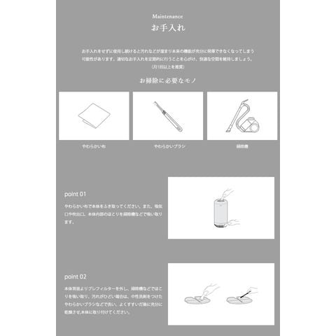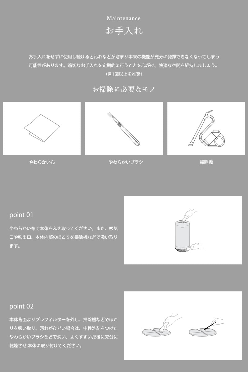 適切なお手入れを定期的に行うことを心がけ、快適な空間を維持しましょう。(月1回以上を推奨)