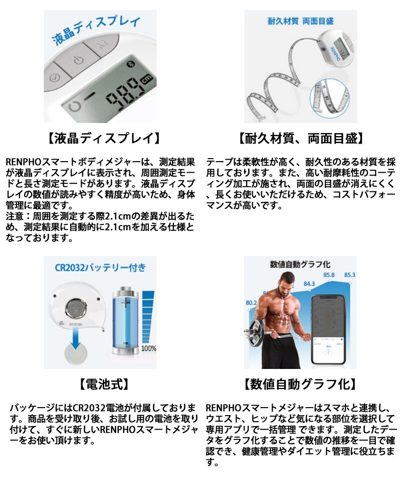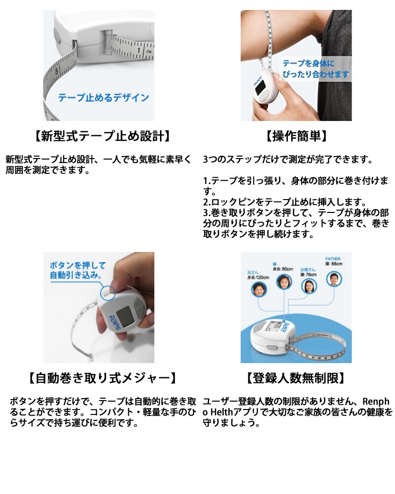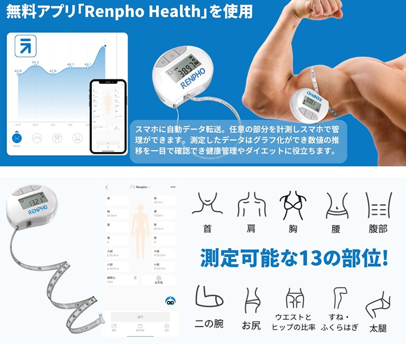 RENPHO レンフォ スマートボディメジャー RF-BMF01 スマホ連動 ダイエット用 メタボ対策 健康管理 自動グラフ化 bluetooth対応 巻き尺 自動巻取り式