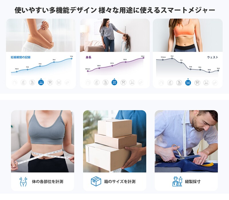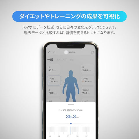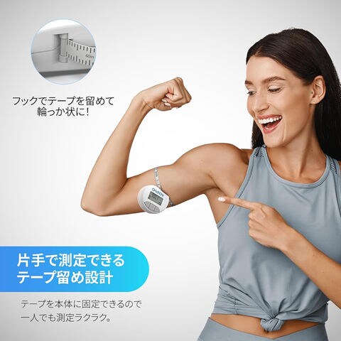 ウエストやヒップなどの届きにくい部分も簡単に測定することができます。