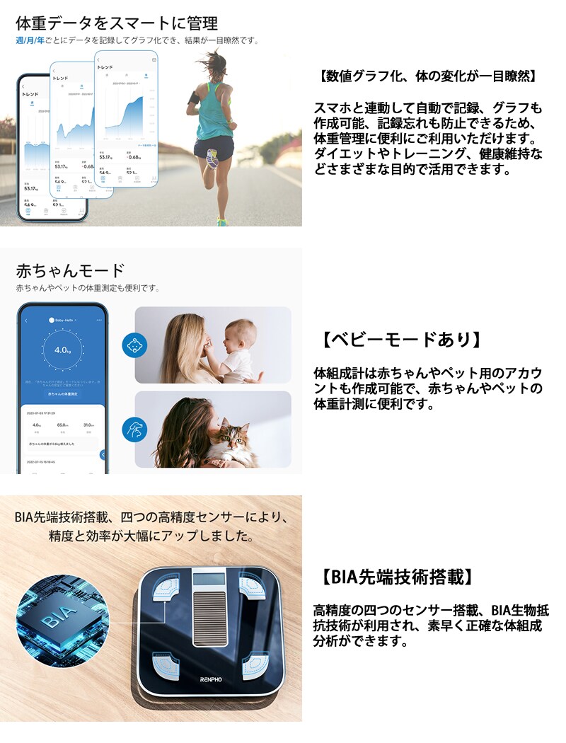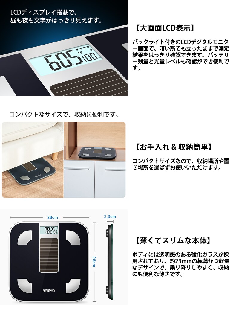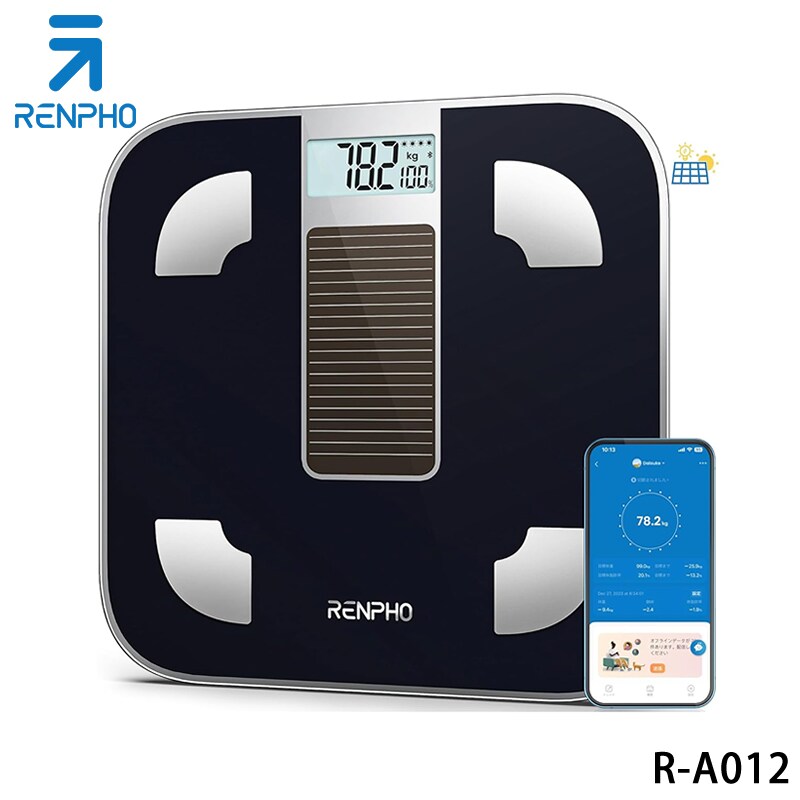 RENPHO レンフォ ソーラーパワー内蔵 体組成計 R-A012 体重計 体組成計 体脂肪計 乾電池不要 ソーラーパネル搭載 体重 体脂肪率 BMI 皮下脂肪
