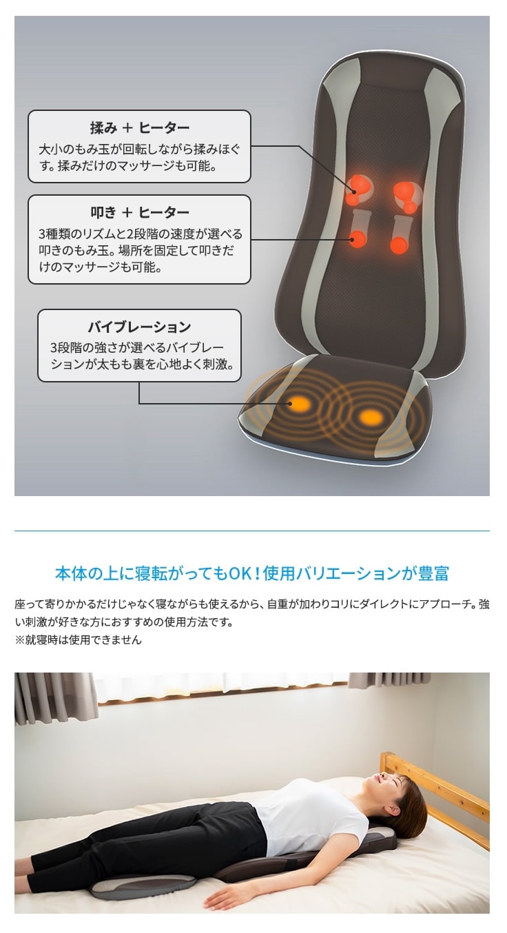 寝ながら使用することで自重が加わり、より強く深い揉み心地を味わえます。