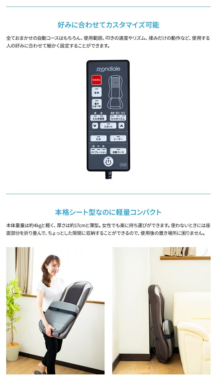 管理医療機器 モンデール コンパクトマッサージシート 極上たたき CM3 マッサージ リラックス 寝ながら 肩甲骨 腰 首 ケア 椅子 ソファ