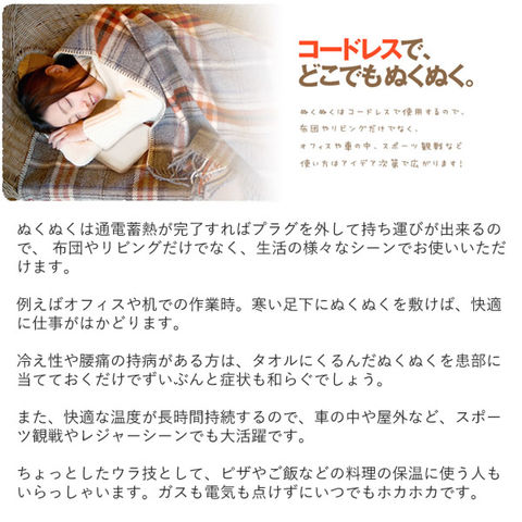 商品名:蓄熱式コードレス電気あんか「ぬくぬく」