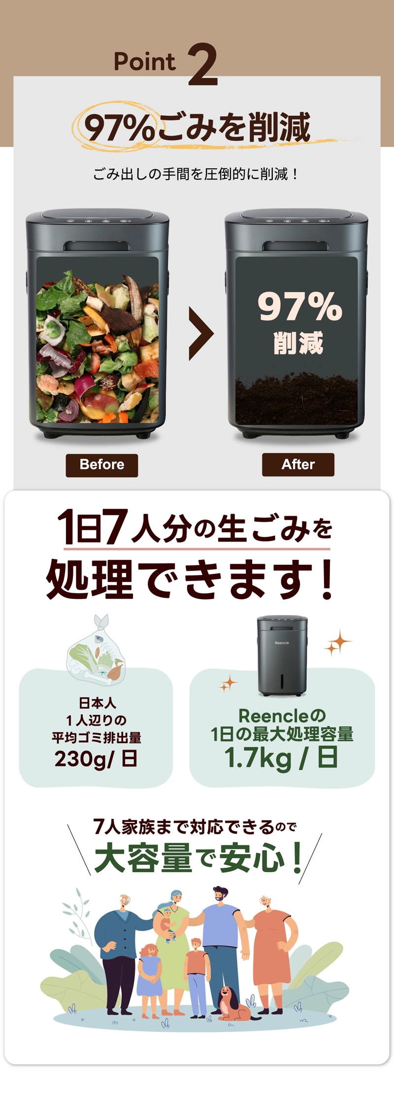 1日7人分までのゴミを処理。ゴミの量が1/10になりゴミ出しの手間を圧倒的に削減できます。