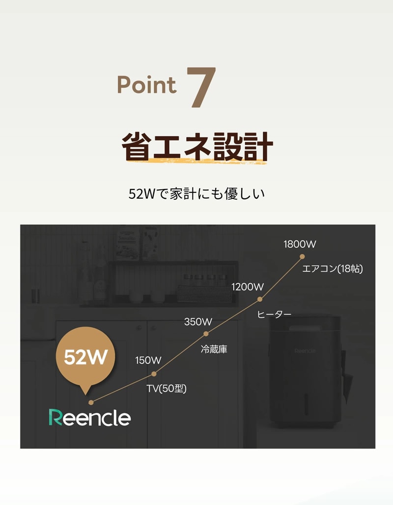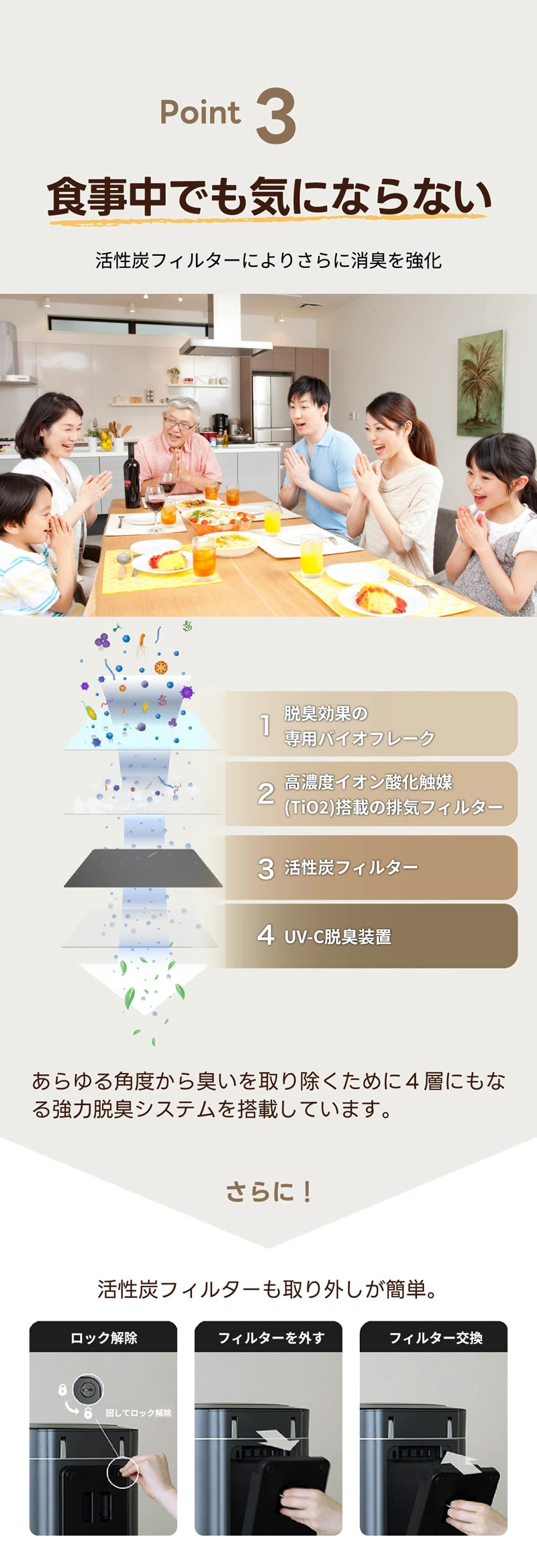 熱を加えて乾燥処理を行う乾燥式に比べ、熱とバイオの力で処理を行うための家計にも優しい省エネ仕様に設計されています。
