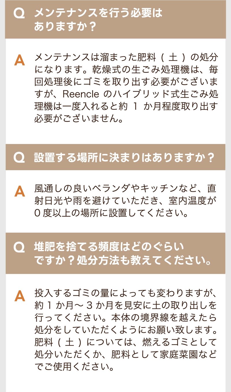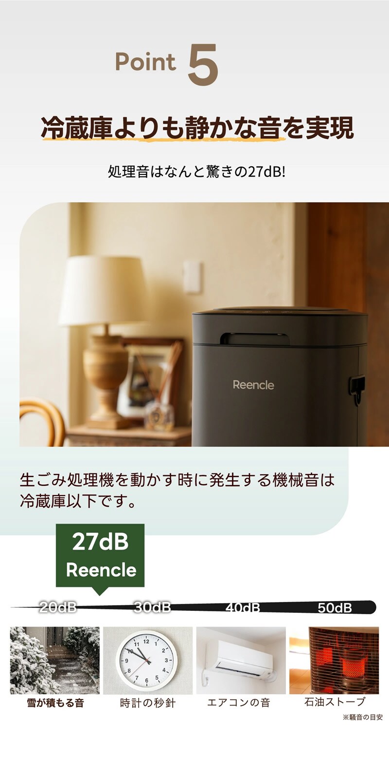 しかし、Reencleの生ごみ処理機はハイブリッド式で内部の攪拌がゆっくりと回転しバイオの力で処理を行うため、処理音を最小限に抑えることができます。