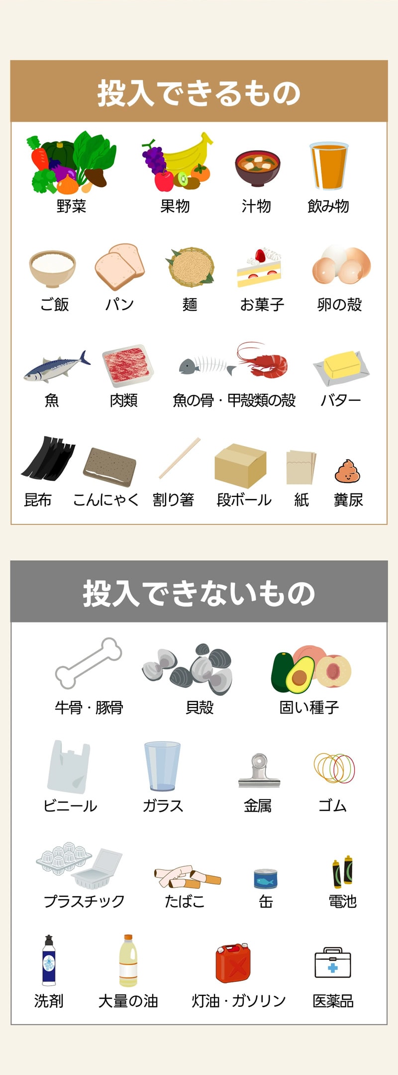 食べ残しだけでなく、ペットのうんち、卵の殻、魚の小骨、味噌汁やジュースも処理可能です。