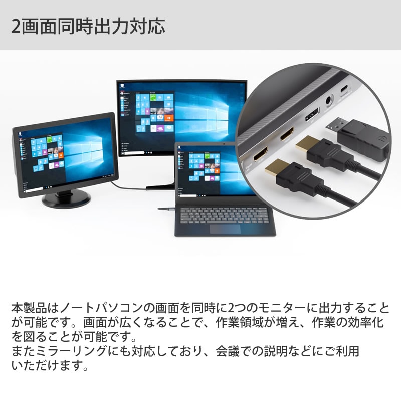 HDMI2ポート+DisplayPortの合計3出力(ノートPCの画面を含む)までの同時表示となります。