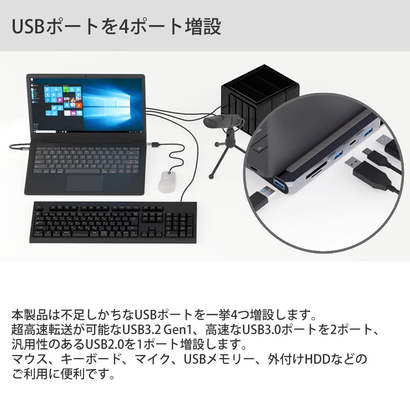 TypeC1つの接続で9種類の役割別(12ポート)を増設することができるドッキングステーションです。