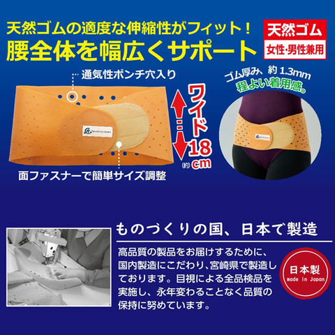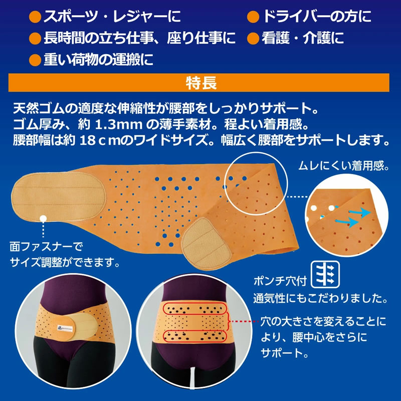 しっかりフィットして腰全体をガード!天然ゴムの適度な伸縮性が腰部をしっかりサポート。