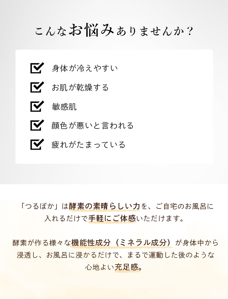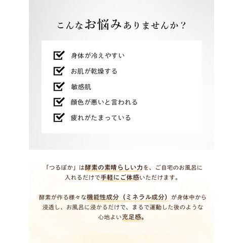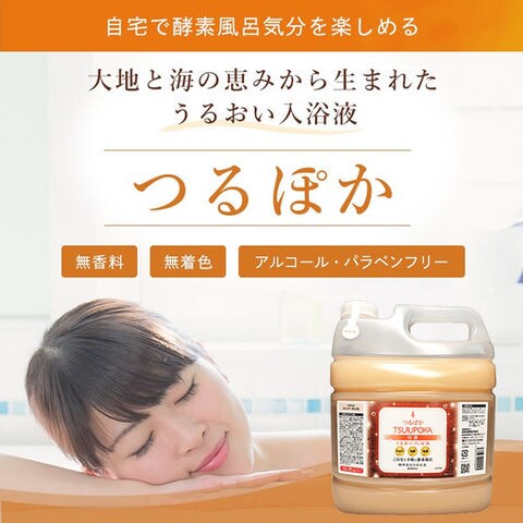 うるおい入浴液『つるぽか』はご自宅のお風呂で酵素風呂のような心地よさを体感することができます。