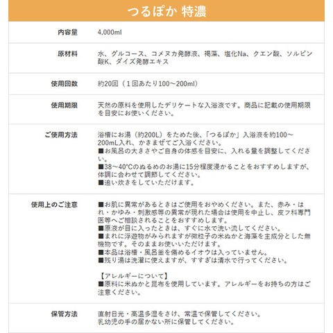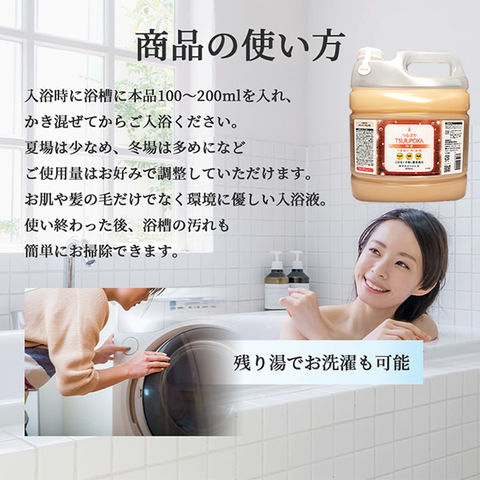 浴槽にお湯(約200L)をためた後、「つるぽか」入浴液を約100~200mL入れ、かきまぜてご入浴ください。