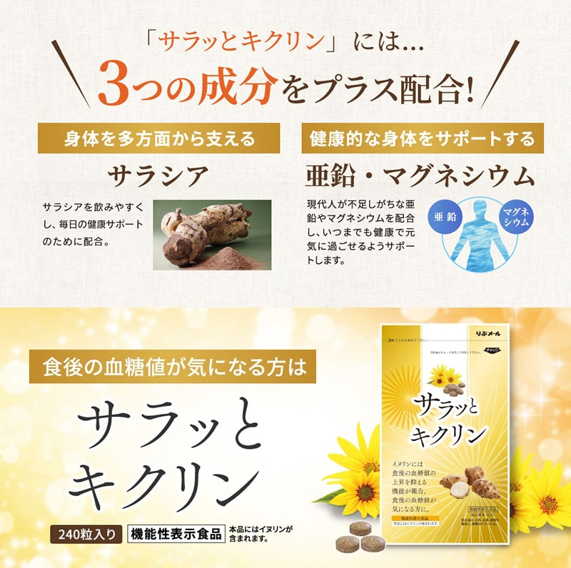 菊芋粉末(国内製造)、澱粉、サラシアエキス末、亜鉛酵母/セルロース、ステアリン酸カルシウム、リン酸カルシウム、酸化マグネシウム、微粒酸化ケイ素、光沢剤