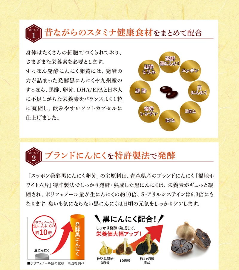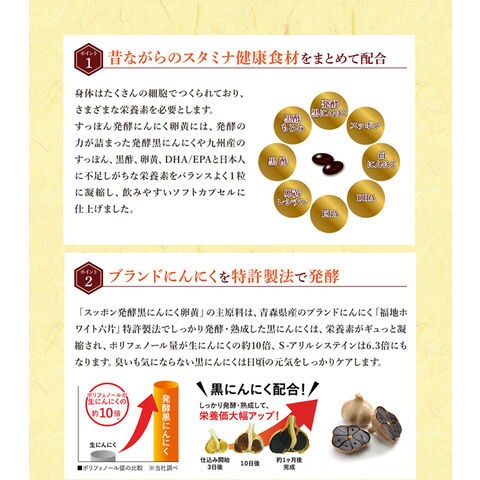 EPA・DHA含有精製魚油、にんにく末、菜種油、食用油脂、発酵黒にんにく末、卵黄油、黒酢もろ味末、すっぽん粉末、米粉、すっぽん卵粉末、黒酢/ゼラチン、グリセリン、ミツロウ、グリセリン脂肪酸エステル、ビタミンE、ビタミンB1