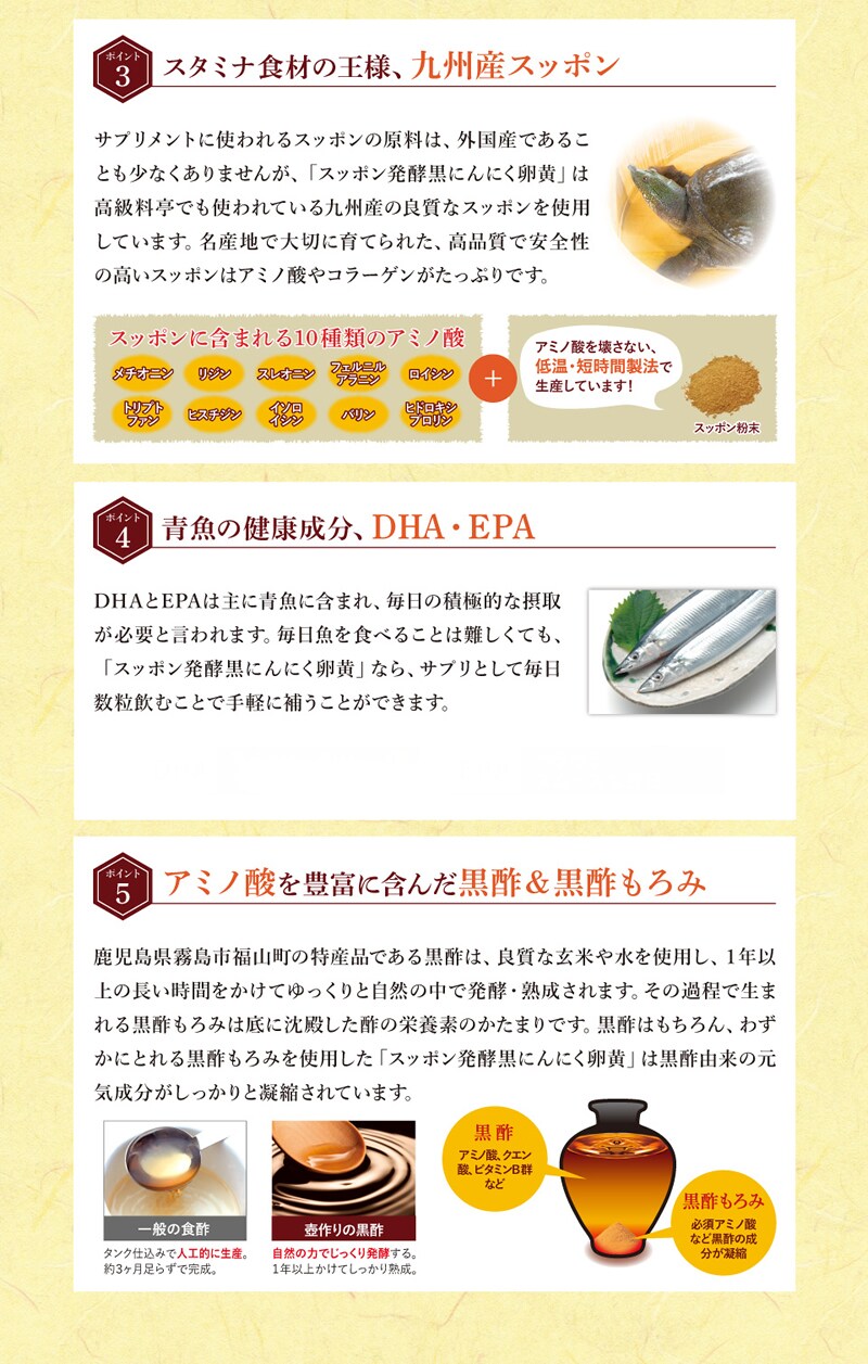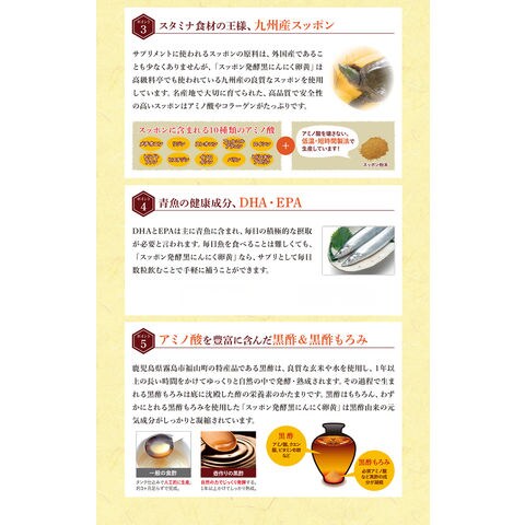 さらに九州産すっぽんにスッポンの卵、鹿児島県産黒酢・黒酢もろみ、サラサラ成分のDHA/EPAと元気生活に欠かせない栄養素をギュッと凝縮しました。