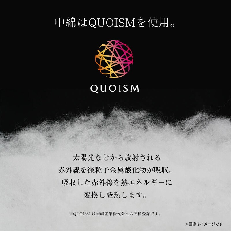 外側は吸湿発熱素材「RENAR(レナー)(R)」、中綿には太陽光などから吸収した赤外線を熱エネルギーに変換し発熱する「QUOISM(クオイズム)(R)」を使用。
