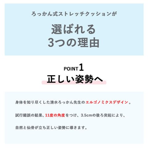 身体を知り尽くした清水ろっかん先生のエルゴノミクスデザイン。試行錯誤の結果、11度の角度をつけ、3.5cmの後ろ突起により、自然と仙骨が立ち正しい姿勢に導きます。