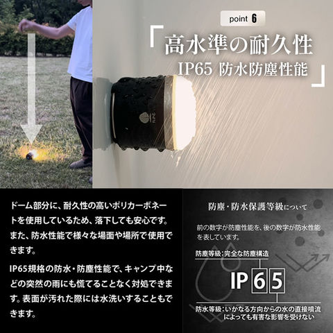 IP65の防水防塵性能を備え、アウトドアでも安心して使えます。
