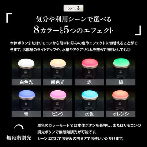 リモコンで簡単に操作でき、8色と5種類のエフェクトモードを楽しめます。
